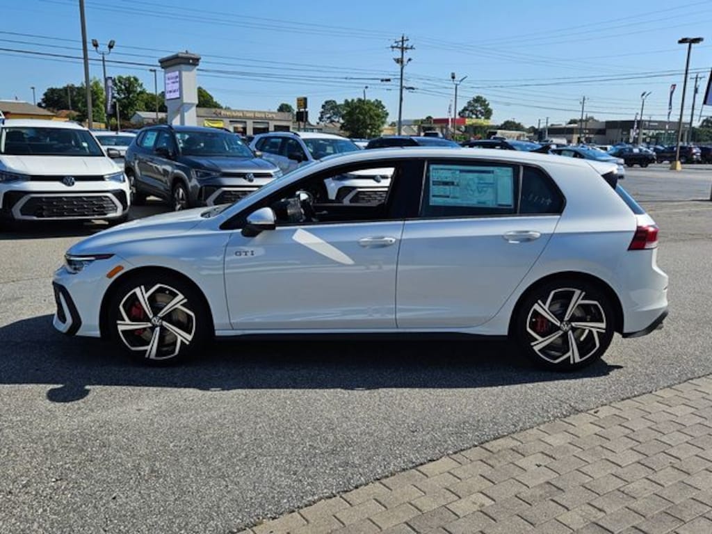 Opal White 2025 Volkswagen Golf GTI 2.0T SE FWD 7-Speed DSG Automatic with Tiptronic 2.0L TSI DOHC 4-Wheel Disc Brakes, 9 Speakers, ABS brakes, Air Conditioning, Alloy wheels, AM/FM radio: SiriusXM with 360L, ArtVelours Seating Surfaces, Auto High-beam Headlights, Auto-dimming Rear-View mirror, Automatic temperature control, Brake assist, Bumpers: body-color, Compass, Delay-off headlights, Driver door bin, Driver vanity mirror, Dual front impact airbags, Dual front side impact airbags, Electronic Stability Control, Emergency communication system: VW Car-Net Safe & Secure 5-year, Exterior Parking Camera Rear, Forward collision: FCW w/Autonomous Emergency Braking mitigation, Four wheel independent suspension, Front anti-roll bar, Front Bucket Seats, Front Center Armrest, Front fog lights, Front reading lights, Fully automatic headlights, harman/kardon® Speakers, Heated door mirrors, Heated front seats, Heated Front Top Sport Seats, Heated steering wheel, Illuminated entry, Leather steering wheel, Low tire pressure warning, Navigation System, Occupant sensing airbag, Outside temperature display, Overhead airbag, Overhead console, Panic alarm, Passenger door bin, Passenger vanity mirror, Power door mirrors, Power driver seat, Power moonroof: Panoramic, Power passenger seat, Power steering, Power windows, Radio data system, Rain sensing wipers, Rear anti-roll bar, Rear reading lights, Rear seat center armrest, Rear window defroster, Rear window wiper, Remote keyless entry, Security system, Speed control, Speed-sensing steering, Speed-Sensitive Wipers, Split folding rear seat, Spoiler, Sport steering wheel, Steering wheel mounted audio controls, Tachometer, Telescoping steering wheel, Tilt steering wheel, Traction control, Trip computer, Turn signal indicator mirrors, Variably intermittent wipers, Wheels: 18" 2-Tone Diamond-Turned Alloy.