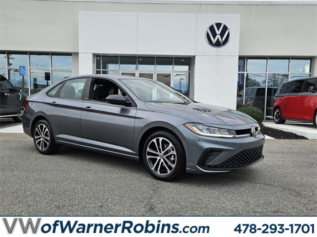 Platinum Gray 2026 Volkswagen Jetta 1.5T Sport FWD 8-Speed Automatic with Tiptronic 1.5L I-4 DI DOHC Turbocharged Black Cloth, 4 Speakers, 4-Wheel Disc Brakes, ABS brakes, Active Blind Spot Monitor, Air Conditioning, Alloy wheels, Auto-dimming Rear-View mirror, Automatic temperature control, Brake assist, Bumpers: body-color, Cloth Seat Trim, Delay-off headlights, Driver door bin, Driver vanity mirror, Dual front impact airbags, Dual front side impact airbags, Electronic Stability Control, Emergency communication system: VW Car-Net Safe & Secure 5-year, Exterior Parking Camera Rear, Front anti-roll bar, Front Bucket Seats, Front Center Armrest, Front dual zone A/C, Front wheel independent suspension, Fully automatic headlights, Heated door mirrors, Heated Front Seats, Heated front seats, Illuminated entry, Leather Shift Knob, Leather steering wheel, Low tire pressure warning, Occupant sensing airbag, Outside temperature display, Overhead airbag, Overhead console, Panic alarm, Passenger door bin, Passenger vanity mirror, Power door mirrors, Power steering, Power windows, Radio data system, Radio: MIB3 Composition Color with 8" Touchscreen, Rain sensing wipers, Rear anti-roll bar, Rear reading lights, Rear seat center armrest, Rear window defroster, Remote keyless entry, Speed control, Speed-sensing steering, Split folding rear seat, Steering wheel mounted audio controls, Tachometer, Telescoping steering wheel, Tilt steering wheel, Traction control, Trip computer, Variably intermittent wipers, Wheels: 17" 2-Tone Machined Alloy, Black Cloth.