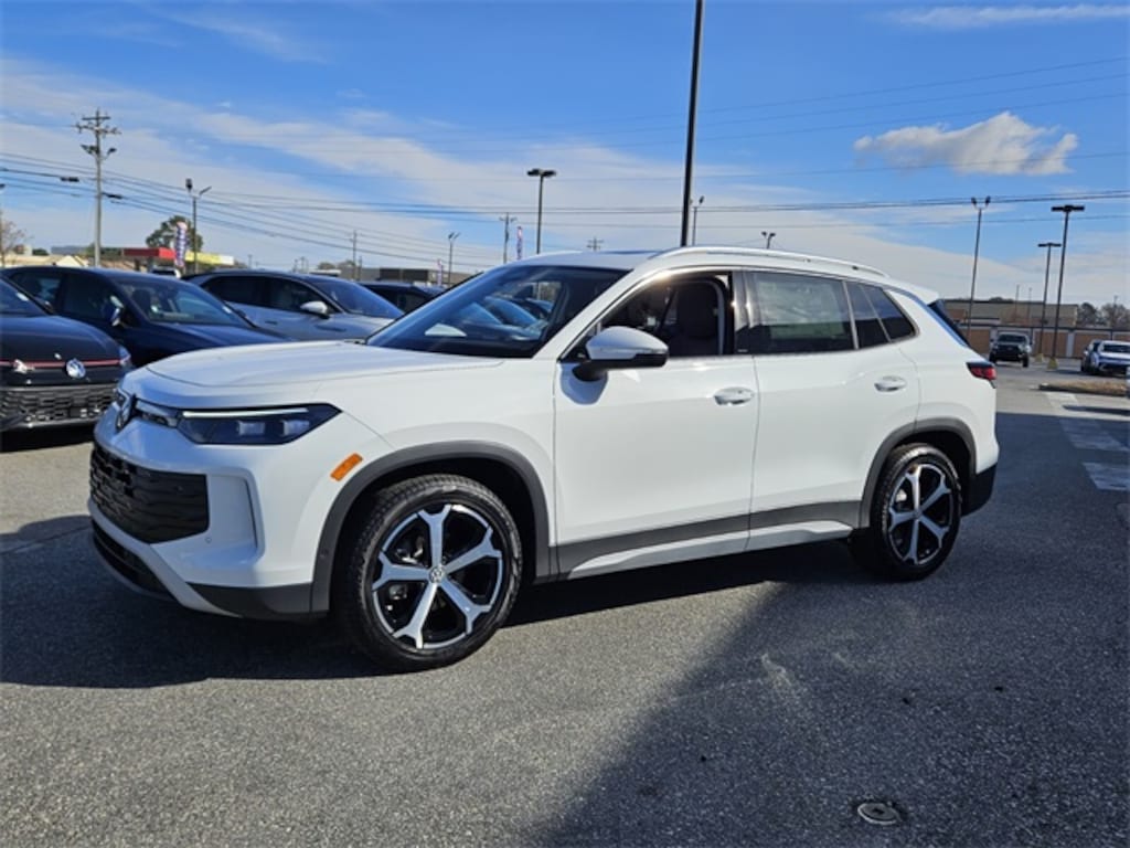 Pure White 2026 Volkswagen Tiguan 2.0T SE FWD 8-Speed Automatic 2.0L TSI DOHC 4-Wheel Disc Brakes, 4-Wheel Independent Suspension, 7 Speakers, ABS brakes, Air Conditioning, Alloy wheels, AM/FM radio: SiriusXM with 360L, Auto High-beam Headlights, Auto-dimming Rear-View mirror, Automatic temperature control, Brake assist, Bumpers: body-color, Compass, Delay-off headlights, Driver door bin, Driver vanity mirror, Dual front impact airbags, Dual front side impact airbags, Electronic Stability Control, Emergency communication system, Exterior Parking Camera Rear, Four wheel independent suspension, Front anti-roll bar, Front Bucket Seats, Front Center Armrest, Front dual zone A/C, Front reading lights, Fully automatic headlights, Heated door mirrors, Heated Front Seats, Heated front seats, Illuminated entry, Knee airbag, Leather Shift Knob, Low tire pressure warning, Occupant sensing airbag, Outside temperature display, Overhead airbag, Overhead console, Panic alarm, Passenger door bin, Passenger vanity mirror, Perforated V-Tex Leatherette Seating Surfaces, Power door mirrors, Power driver seat, Power Liftgate, Power steering, Power windows, Radio data system, Radio: MIB4 Composition Media Touchscreen with AM/FM, Rain sensing wipers, Rear anti-roll bar, Rear reading lights, Rear seat center armrest, Rear side impact airbag, Rear window defroster, Rear window wiper, Remote keyless entry, Security system, Speed control, Speed-sensing steering, Split folding rear seat, Spoiler, Steering wheel mounted audio controls, Tachometer, Telescoping steering wheel, Tilt steering wheel, Traction control, Trip computer, Turn signal indicator mirrors, Variably intermittent wipers, Wheels: 19" 2-Tone Machined Alloy.