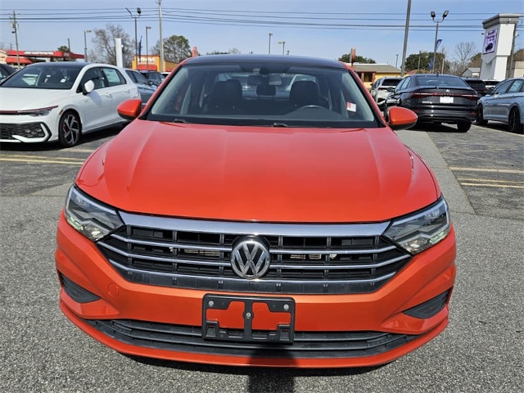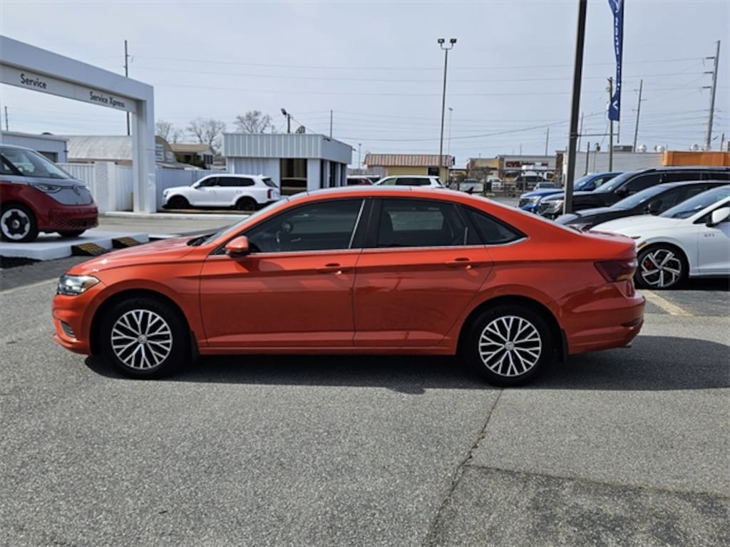 Burnt Orange 2019 Volkswagen Jetta 1.4T S FWD 8-Speed Automatic with Tiptronic 1.4L TSI This Jetta is equipped with. Titan Black Cloth, 4 Speakers, 4-Wheel Disc Brakes, ABS brakes, Air Conditioning, Alloy wheels, AM/FM radio, Brake assist, Bumpers: body-color, Cloth Seat Trim, Delay-off headlights, Driver door bin, Driver vanity mirror, Dual front impact airbags, Dual front side impact airbags, Electronic Stability Control, Exterior Parking Camera Rear, Front anti-roll bar, Front Bucket Seats, Front Center Armrest, Front Comfort Seats, Front wheel independent suspension, Fully automatic headlights, Illuminated entry, Low tire pressure warning, Occupant sensing airbag, Outside temperature display, Overhead airbag, Panic alarm, Passenger door bin, Passenger vanity mirror, Power door mirrors, Power steering, Power windows, Radio data system, Radio: Composition Color w/6.5" Touchscreen, Rear anti-roll bar, Rear reading lights, Rear window defroster, Remote keyless entry, Speed control, Speed-sensing steering, Split folding rear seat, Steering wheel mounted audio controls, Tachometer, Telescoping steering wheel, Tilt steering wheel, Traction control, Trip computer, Variably intermittent wipers, Wheels: 16" Silver Rama, Titan Black Cloth.